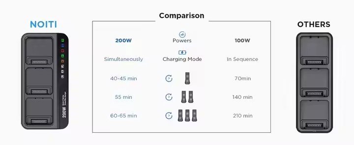 - 【𝟯.𝟱𝗫 𝗙𝗮𝘀𝘁 𝗖𝗵𝗮𝗿𝗴𝗶𝗻𝗴】The Charging Hub for DJI Mavic 3 Series has a power of 200W, and can immediately charge 3 batteries. The charging time in 95% Fast Charging Mode for 1 battery is 40 min, and for 3 batteries it is 60 min. Operating Temperature: 41° to 104℉ (5° to 40℃). Input Power: 200W.